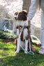 Murphy is wearing our Classic Standard Biothane Traffic Handle Leash in Wine and Navy with the Classic Snap